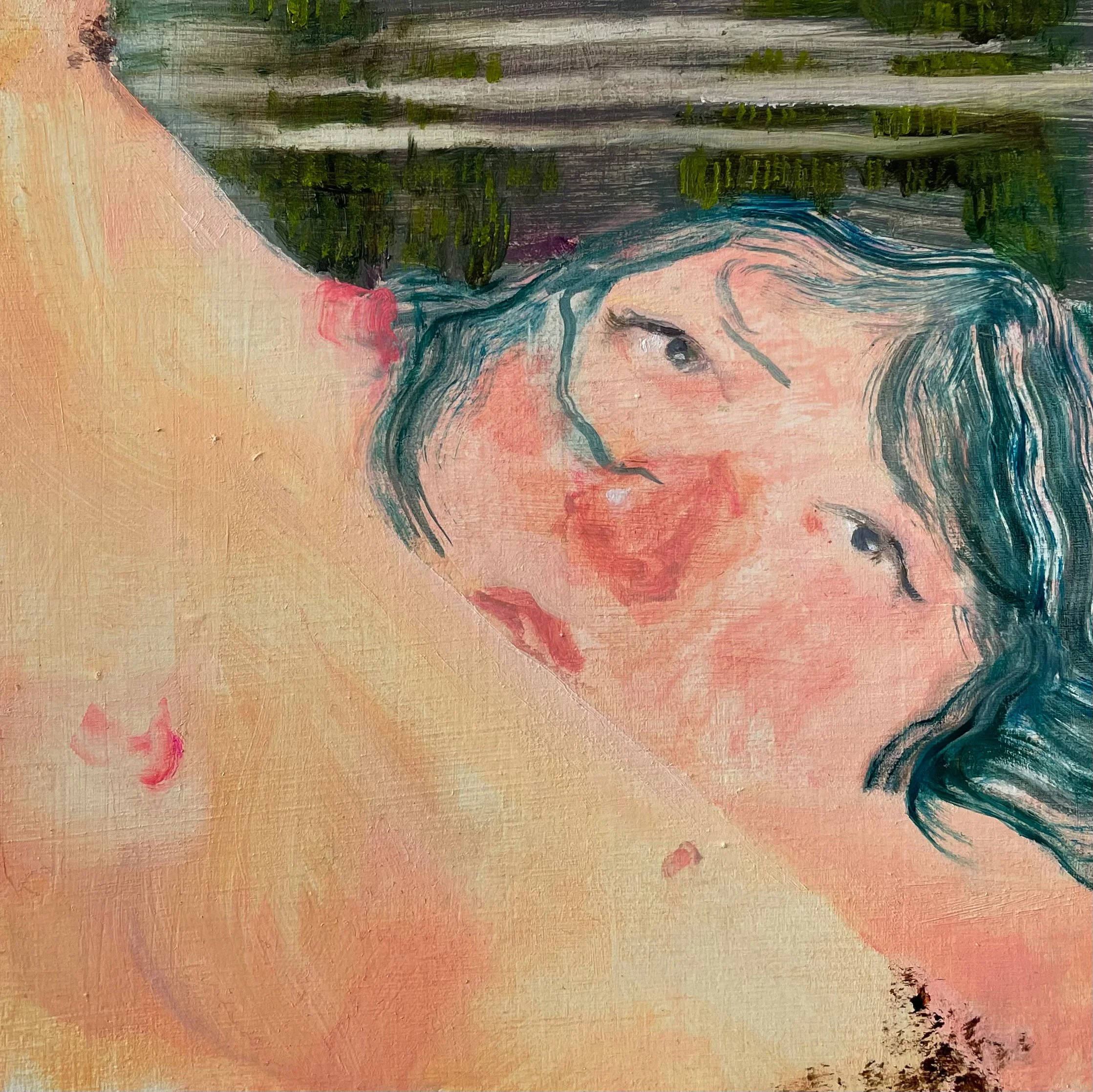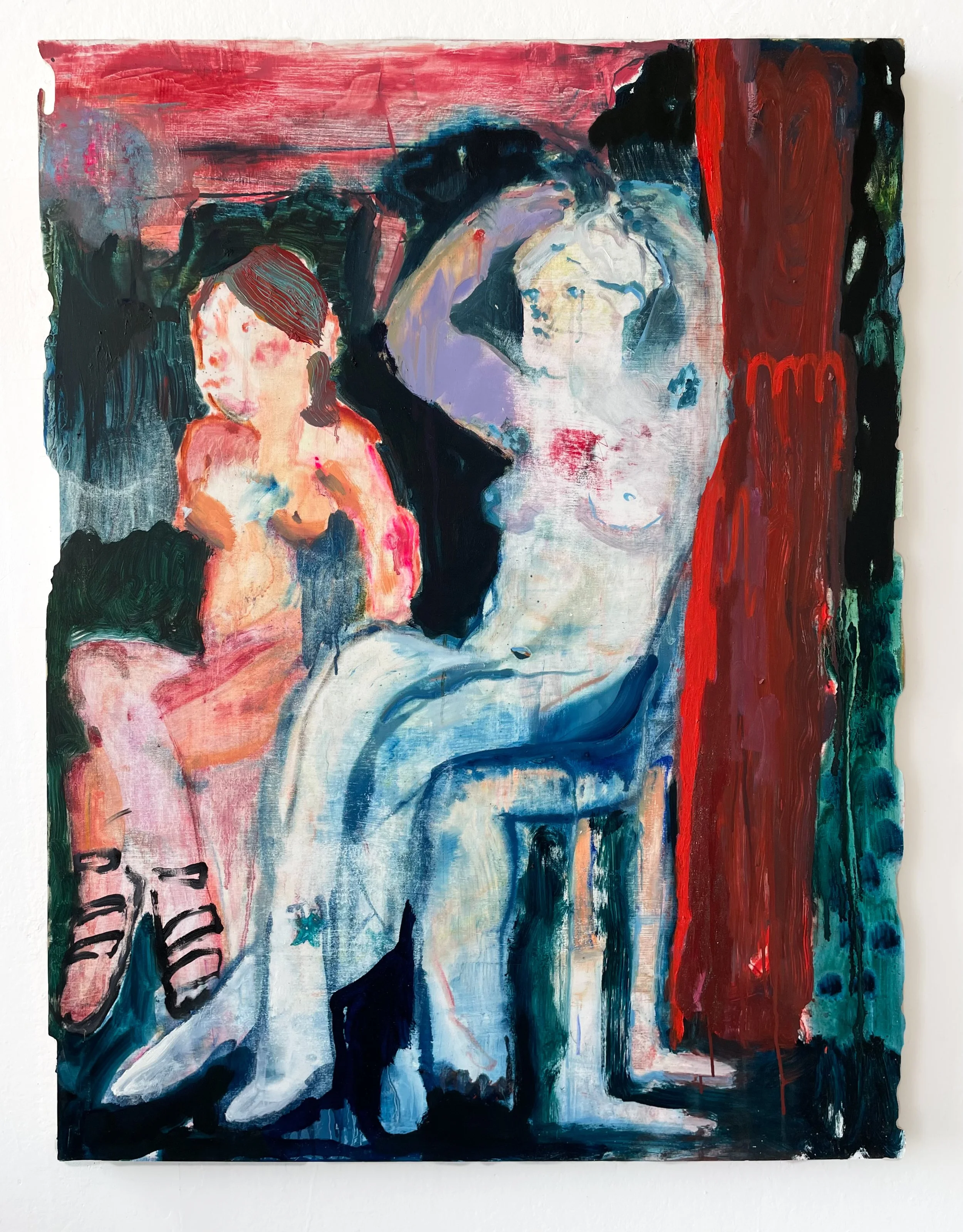 "sitting on my exes", 2022, oil paint on panel, 48 x is 36 inches.
